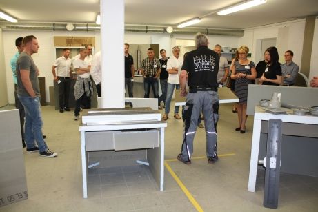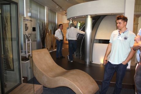 Danach ging es für alle Teilnehmer ins Trainingscenter. Dort fand der erste Praxisrundgang in zwei Gruppen statt. Während die Gruppe „Kreis“ zunächst in den Praxisräumen den Einbau einer Duschtasse mitverfolgen konnte, wurden der Gruppe „Quadrat“ in der Ausstellung die technischen Details der Duschböden an mehreren Modellen erklärt. Anschließend wechselten die Gruppen die Räume.