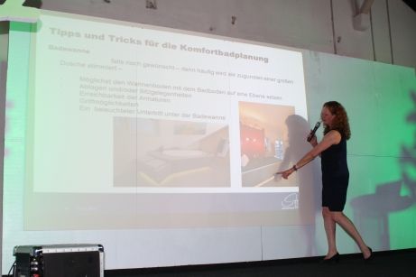 Anschließend folgte ein weiteres Highlight: zum Ende des Veranstaltungstages referierte Andrea Stark über das "Komfortbad von morgen". Die selbständige Innenarchitektin und staatlich geprüfte Betriebswirtin verfügt über 25 Jahre Erfahrung im Bäderbau und ist außerdem Buchautorin. Zusätzlich führt sie Seminare zur Gestaltung durch und schreibt Fachartikel. In ihrem Vortrag zeigte Andrea Stark anschaulich mit vielen Bildbeispielen wie man ein Bad vorausschauend für alle Generationen plant und dabei die Attribute „schön“ und „praktisch“ vereint. Dabei verwies die Referentin auch auf die Möglichkeit der Förderung durch die KfW.
