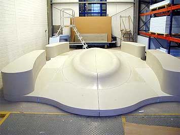 Das zentral gelegene Teichbecken mit den tropfenförmigen Ruhebänken nach der Fertigstellung und während der Produktionsphase. Nach der Fertigung wurden die Elemente in der Werkhalle von Lux Elements aufgebaut.