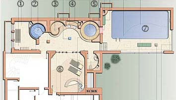 Die neue Wellness-Landschaft erstreckt sich nach der Fertigstellung über zwei versetzte Ebenen. Die Schwimmhalle, die an das Wohnhaus angebaut ist und einen ebenerdigen Zugang zum großzügigen Garten des Anwesens besitzt, ist über fünf Stufen aus dem umgebauten Untergeschoß zu erreichen. Hier befinden sich neben einer Dampfsauna mit Lichttherapie, einer Schneckendusche und einem Whirlpool mit Sternenhimmel auch eine Wärmebank mit Fußbad, ein großer Ruheraum sowie ein Gymnastikbereich. Im Mittelpunkt der Anlage lenkt eine große Wasserkugel, um die alle Funktionsbereiche gruppiert sind, die Aufmerksamkeit auf sich.